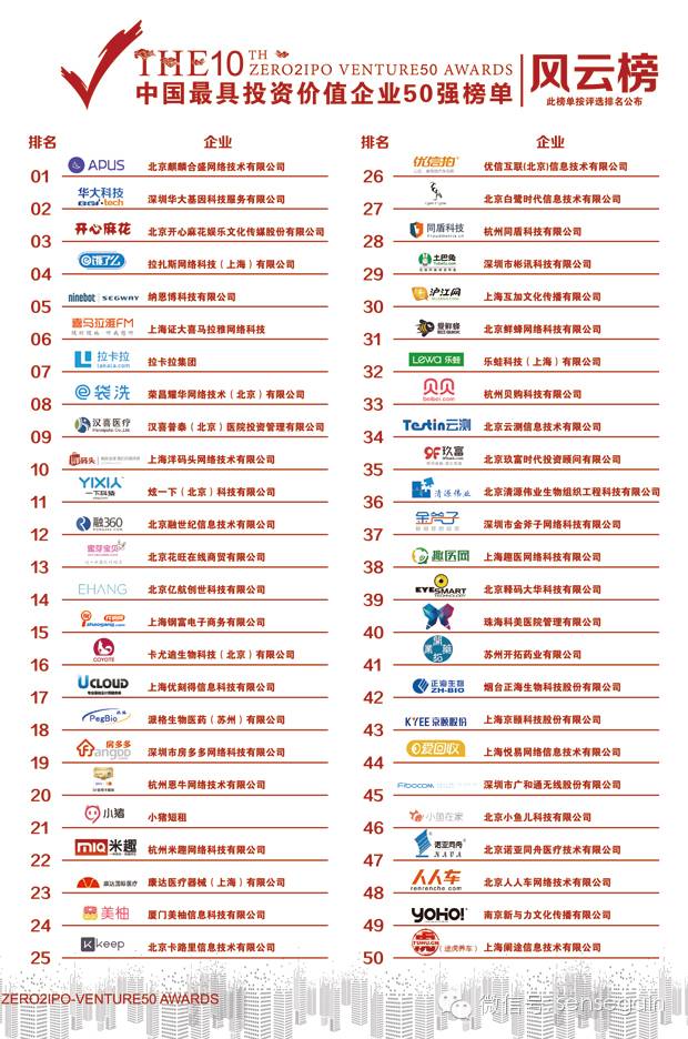 2015年12月2日,在第六届中国高成长企业CEO峰会上,第十届“中国最具投资价值企业50强”评选榜单正式发布。自2006年发布以来,已成功举办十届,被誉为“行业投资风向标”。清科集团在广泛征集了超过4000家企业,汇聚了投资界精英们的专业意见最终缔造了本届中国最具投资价值企业新芽榜50强和风云榜50强。其中由盛世景投资的京颐股份(43位)和其参股的趣医网(38位)分别上榜风云榜。